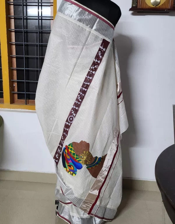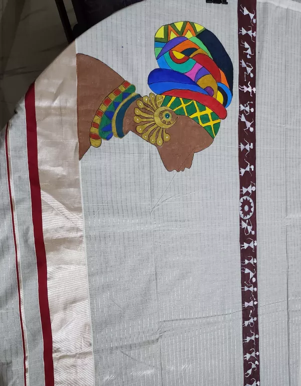 Celebrate heritage and expression with our African Lady Handpainted Kerala Saree — a bold fusion of art and tradition. Handcrafted on soft cotton, this saree features a striking portrait of an African woman, symbolizing strength, beauty, and culture. A perfect piece for art lovers and style rebels alike.