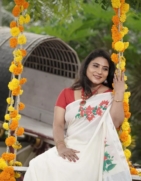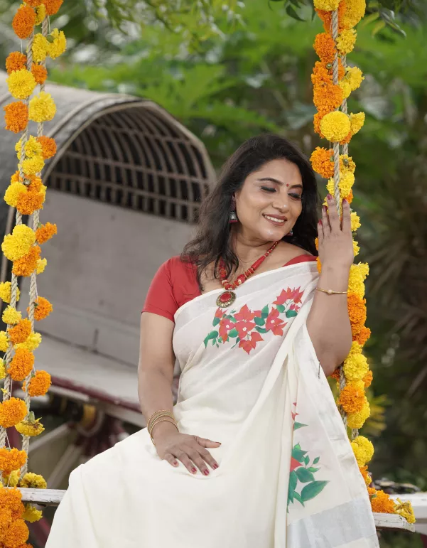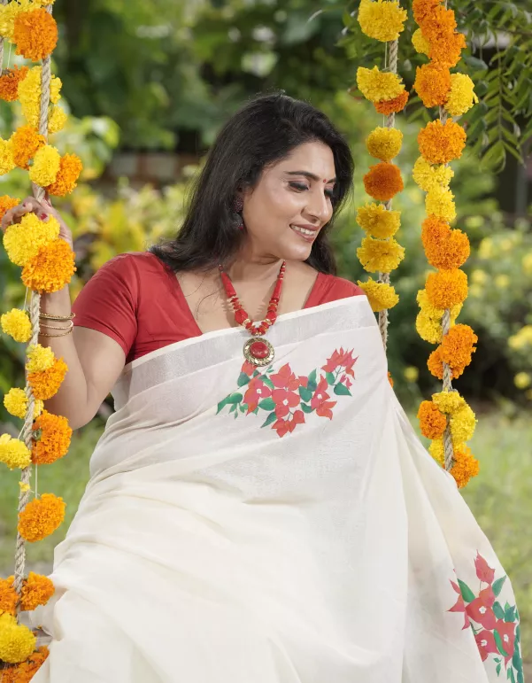 Delicate yet vibrant, this Bougainvillea Handpainted Kerala Saree celebrates floral grace with hand-painted bougainvillea blooms cascading across soft cotton. The silver zari border (2*3 pattern) adds a subtle festive shine, making it perfect for casual celebrations, day functions, or gifting.