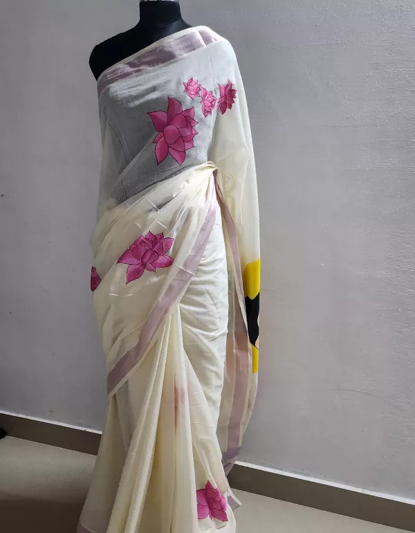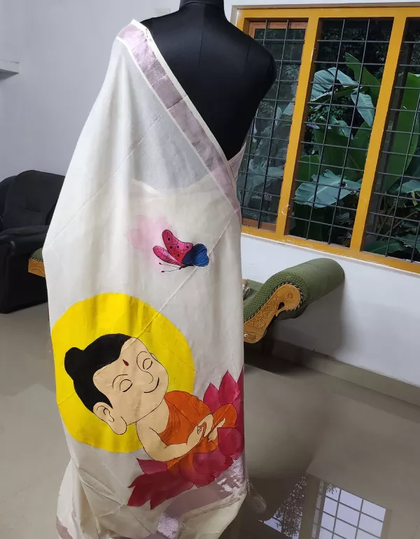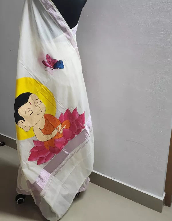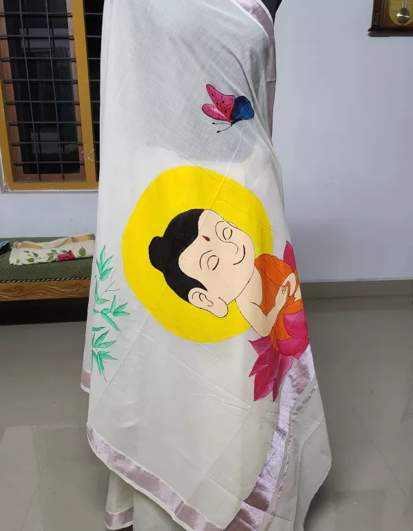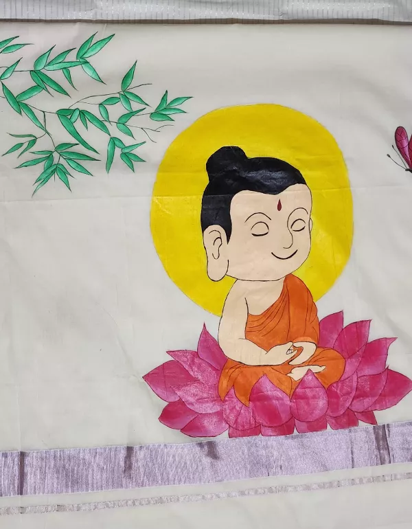 Experience serenity and artistry in one elegant drape. This Budha Handpainted Kerala Saree features a meditative motif, carefully hand-painted by our in-house artists, symbolizing peace, mindfulness, and grace. The rose gold border adds a subtle luxurious finish, perfect for meaningful occasions or thoughtful gifting.