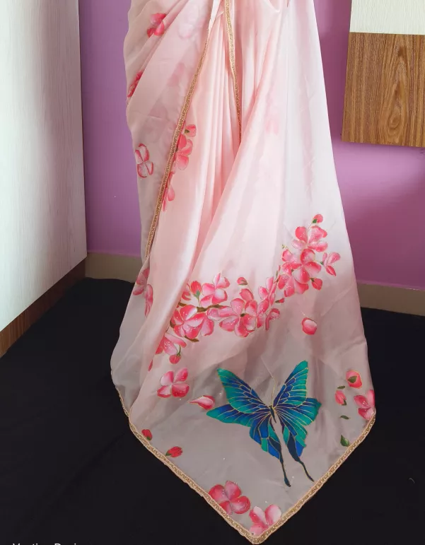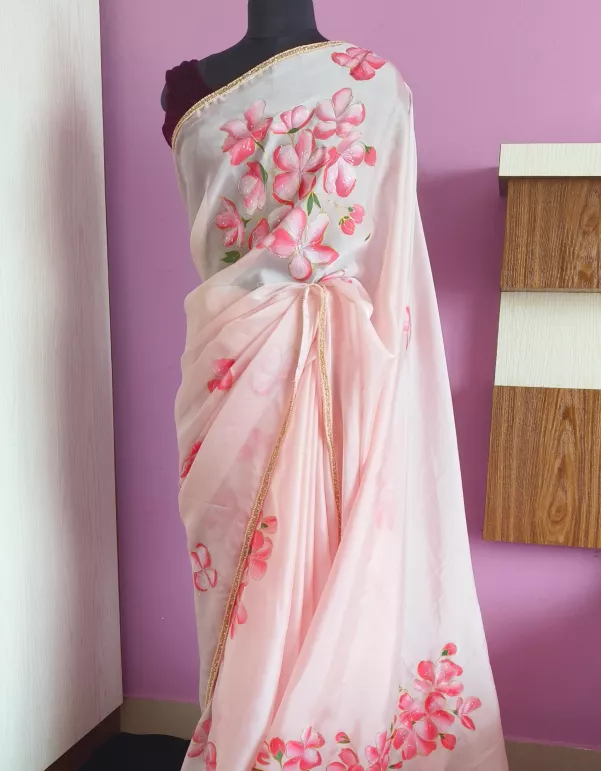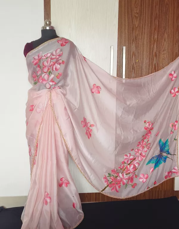 Breathe in the beauty of spring with our Cherry Blossom Handpainted Saree, crafted in sheer, flowing silk organza. Featuring hand-painted cherry blossoms in soft tones of blush and rose, this piece is finished with fine handwork on the border, adding a touch of luxury to its delicate charm. A true heirloom for the woman who dresses with grace and intention.
