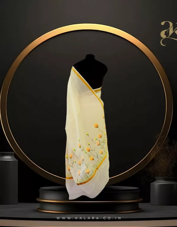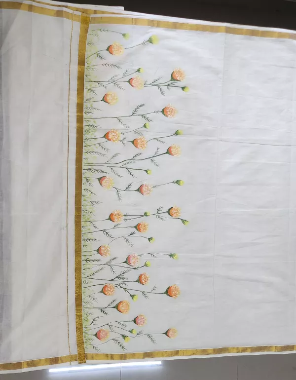 Infused with the festive charm of marigolds, this handpainted Kerala saree is a radiant blend of tradition and artistry. Crafted on breathable gold-toned cotton, each petal is hand-brushed with love — making every saree truly one of a kind.