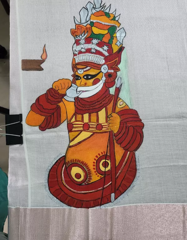Embody tradition and divine artistry with this Muthappan Handpainted Kerala Saree, crafted in elegant onion gold tissue cotton. The powerful hand-painted depiction of Sree Muthappan, a revered deity in Kerala, makes this saree a spiritual statement — rooted in culture and reverence.