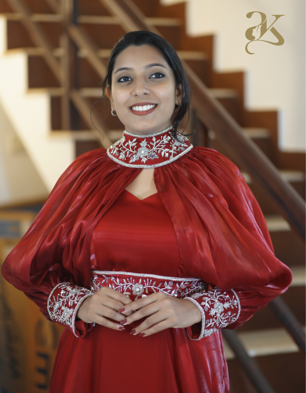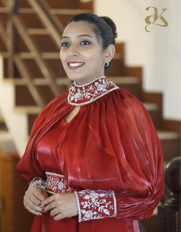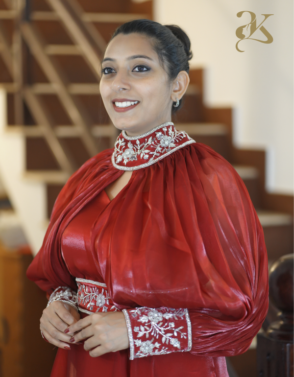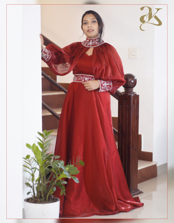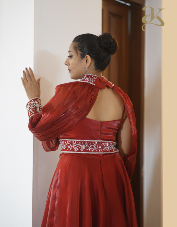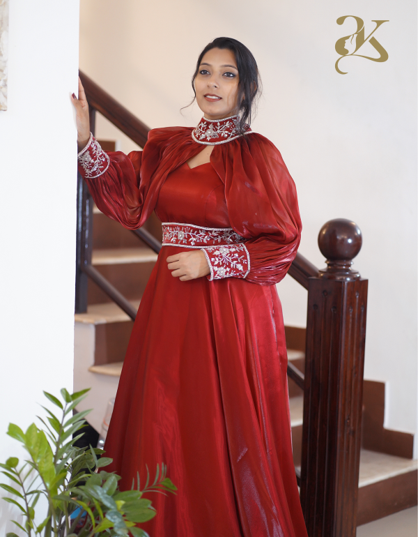 The embroidered neckline, embellished waist detailing, and dramatic cape-style sleeves give this outfit a regal touch. The gown’s rich red tone makes it a showstopper for any event, blending traditional elegance with modern designer craftsmanship.