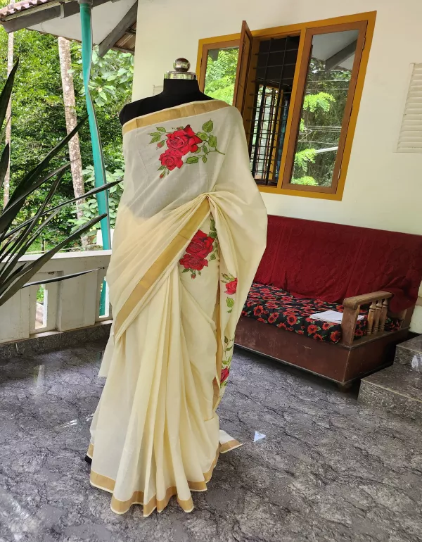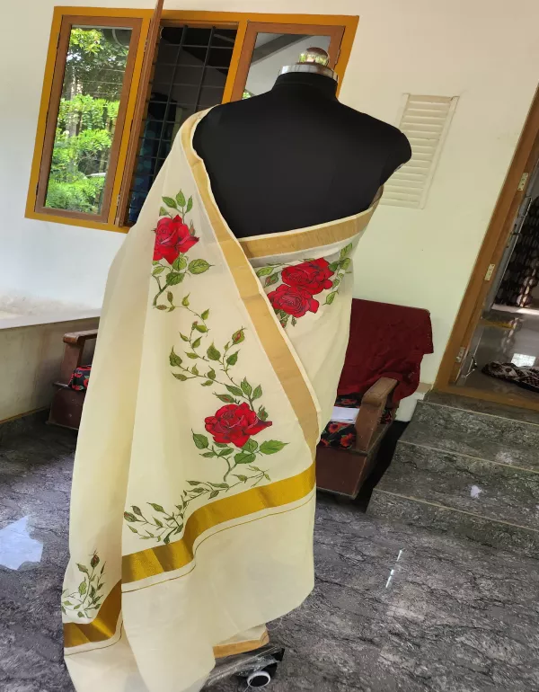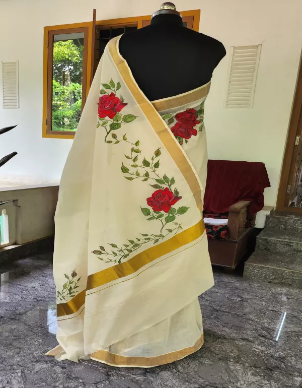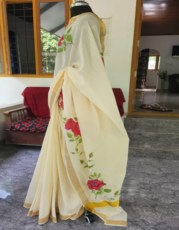 Delicate, timeless, and entirely handcrafted — this Rose Hand-Painted Kerala Saree is a celebration of elegance in every brushstroke. Made from soft, breathable pure cotton, it features a hand-painted rose motif that blends tradition with artistic expression.