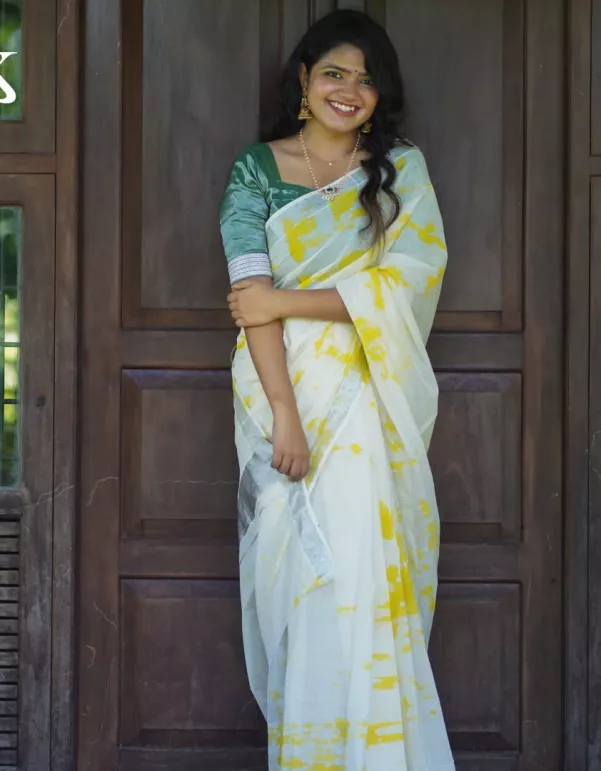 Turn heads with this Tie-Dye Kerala Saree featuring a sleek silver zari border — a refreshing twist on a timeless classic. Handcrafted on soft viscose cotton, this saree blends the comfort of cotton with the charm of traditional Kerala aesthetics and modern tie-dye patterns.