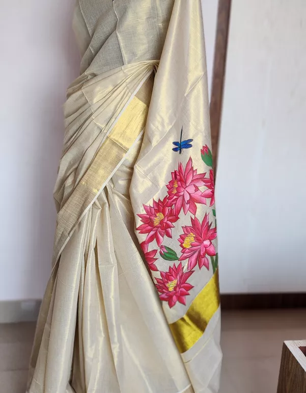 Embrace serenity and elegance with our Water Lily Handpainted Kerala Saree. Crafted on luxurious tissue cotton, this saree features delicate hand-painted water lilies — capturing the still beauty of nature with a soft shimmer that makes every drape glow.